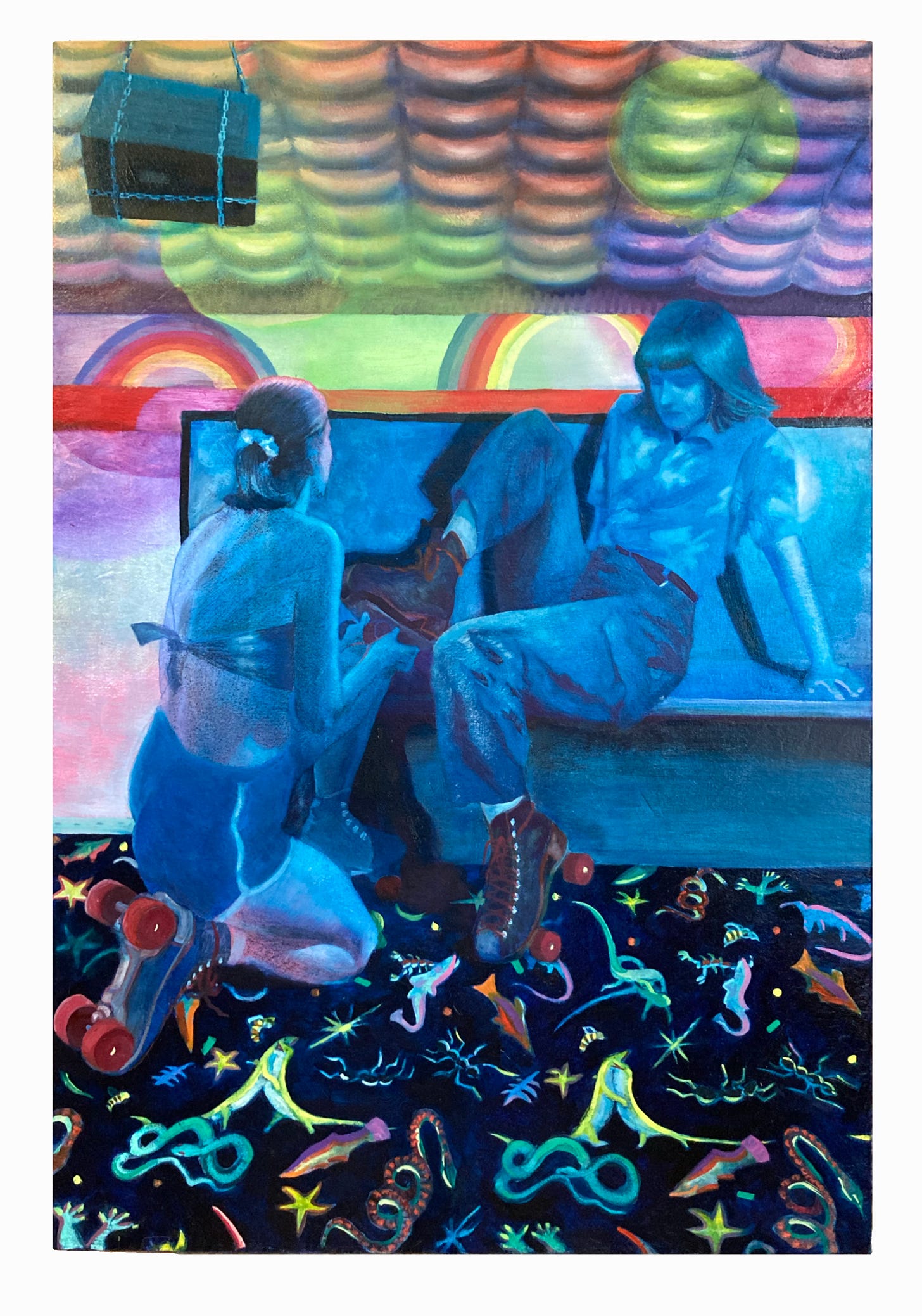 Right before Covid, my partner at the time and I put on a two person show featuring myself and another artist. I’d heard that because Chicago is a more affordable city, there are a lot of artists run spaces and galleries. Putting together that show felt like a big milestone. We didn’t sell anything, but the opening was really fun. We put a lot of effort into an installation in the gallery along with the paintings on the wall, and we painted the floor to make it all feel like a playroom.