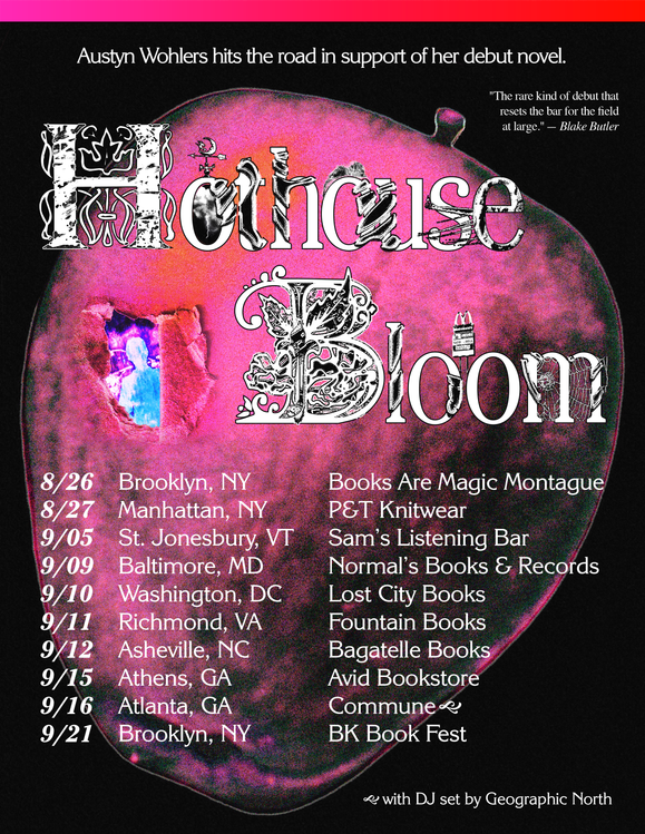 Austyn Wohlers was born in 1996. Her debut novel Hothouse Bloom was called "strikingly original" by Mesha Maren in The New York Times and "the rare kind of review that resets the bar for the field at large" by Blake Butler. Her writing has appeared in The Baffler, The Massachusetts Review, Guernica, and elsewhere. Also a musician, she releases music under her name and with the band Tomato Flower. Order a copy of HOTHOUSE BLOOM | Book Tour Dates